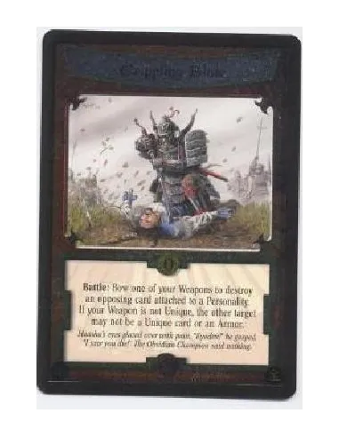 Battle: Bow one of your Weapons to destroy an opposing card attached to a Personality. If your Weapon is not Unique, the other target may not be a Unique card or an Armor.
