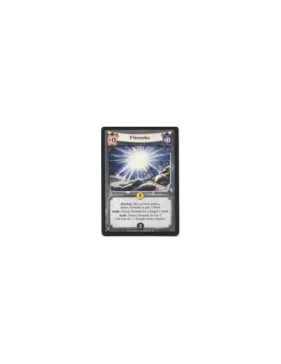 Reaction: After an Event resolves, destroy Fireworks to gain 2 Honor.Battle: Destroy Fireworks for a Ranged 3 Attack.Battle: Destroy Fireworks for Fear 2. This Fear has +3 strength versus Creatures.
