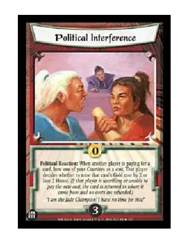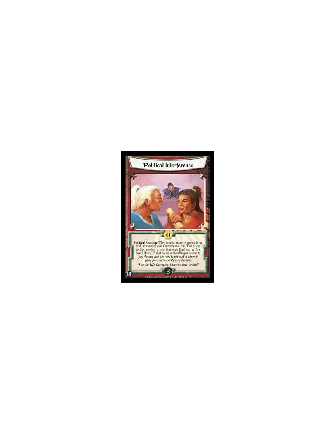 Political Reaction: When another player is paying for a card, bow one of your Courtiers as a cost. That player decides whether to raise that card's Gold cost by 2 or lose 2 Honor. (If that player is unwilling or unable to pay the new cost, the card is returned to where it came from and no costs are refunded.)