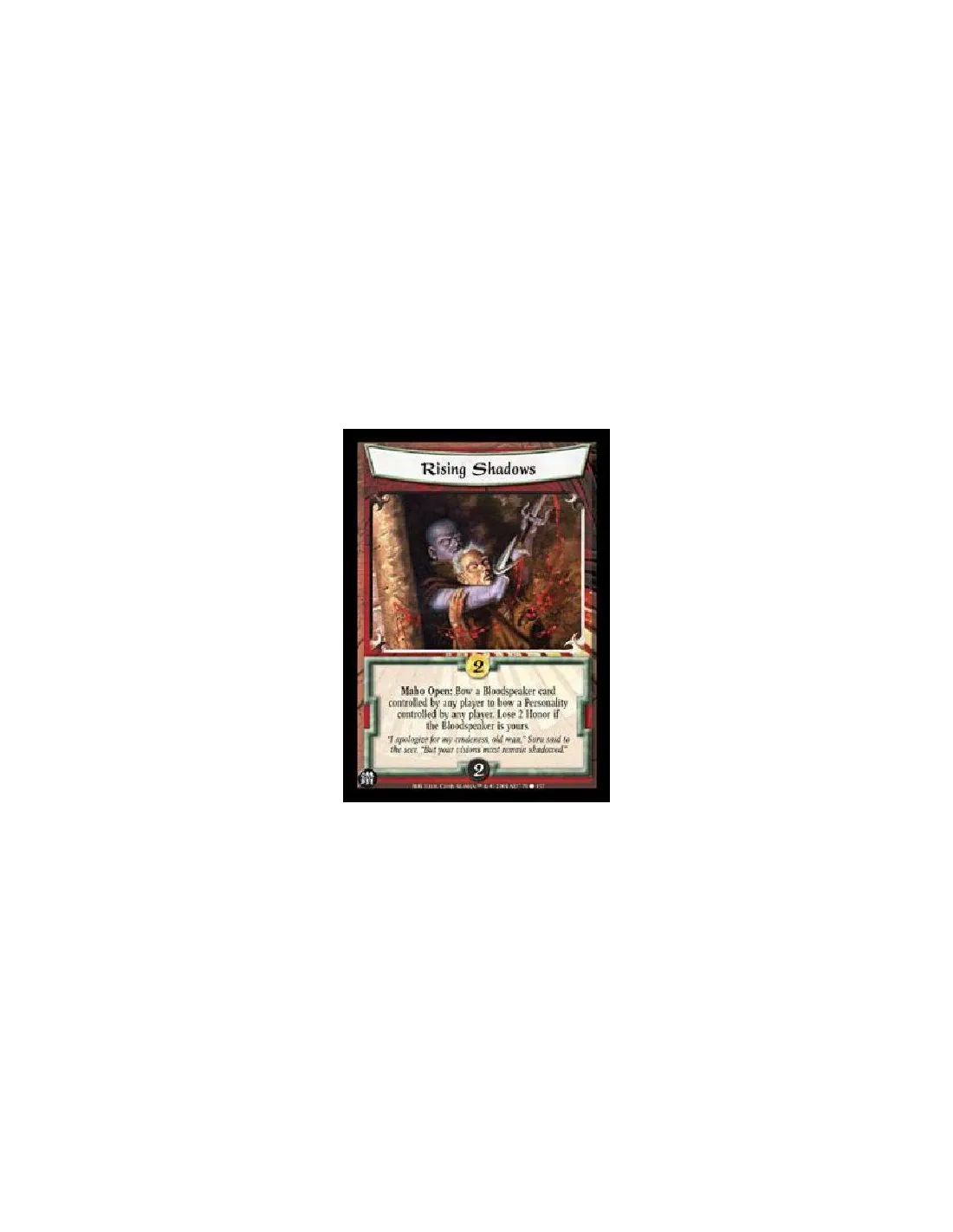 Maho Open: Bow a Bloodspeaker card controlled by any player to bow a Personality controlled by any player. Lose 2 Honor if the Bloodspeaker is yours.