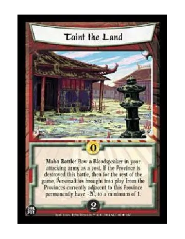 Maho Battle: Bow a Bloodspeaker in your attacking army as a cost. If the Province is destroyed this battle, then for the rest of the game, Personalities brought into play from the Provinces currently adjacent to this Province permanently have -2C, to a minimum of 1.