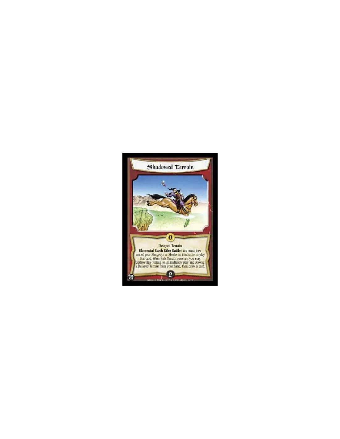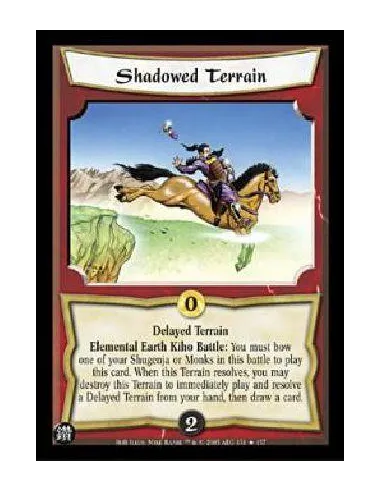 Delayed TerrainElemental Earth Kiho Battle: You must bow one of your Shugenja or Monks in this battle to play this card. When this Terrain resolves, you may destroy this Terrain to immediately play and resolve a Delayed Terrain from your hand, then draw a card.
