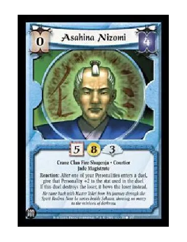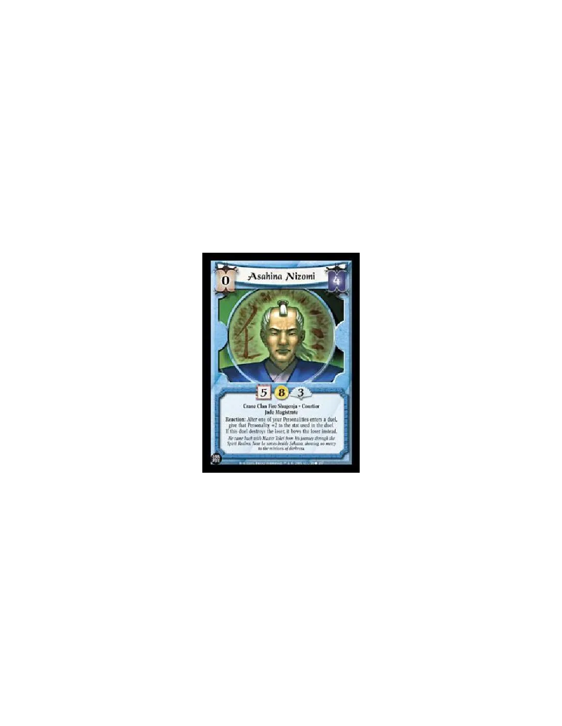 Crane Clan Fire Shugenja. Courtier. Jade Magistrate Reaction: After one of your Personalities enters a duel, give that Personality +2 to the stat used in the duel. If this duel destroys the loser, it bows the loser instead.