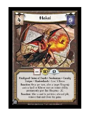 Unaligned Onisu of Death · Nonhuman · CavalryUnique · Shadowlands · Lose 5 Honor.Reaction: Once per turn, after a target Shugenja casts a Spell or Kiho or uses an innate ability, permanently give that Shugenja -2C.Reaction: After a card is put into a discard pile, remove that card from the game.