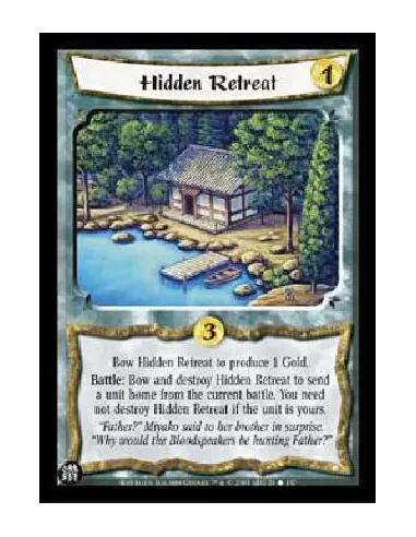 Bow Hidden Retreat to produce 1 Gold.Battle: Bow and destroy Hidden Retreat to send a unit home from the current battle. You need not destroy Hidden Retreat if the unit is yours.