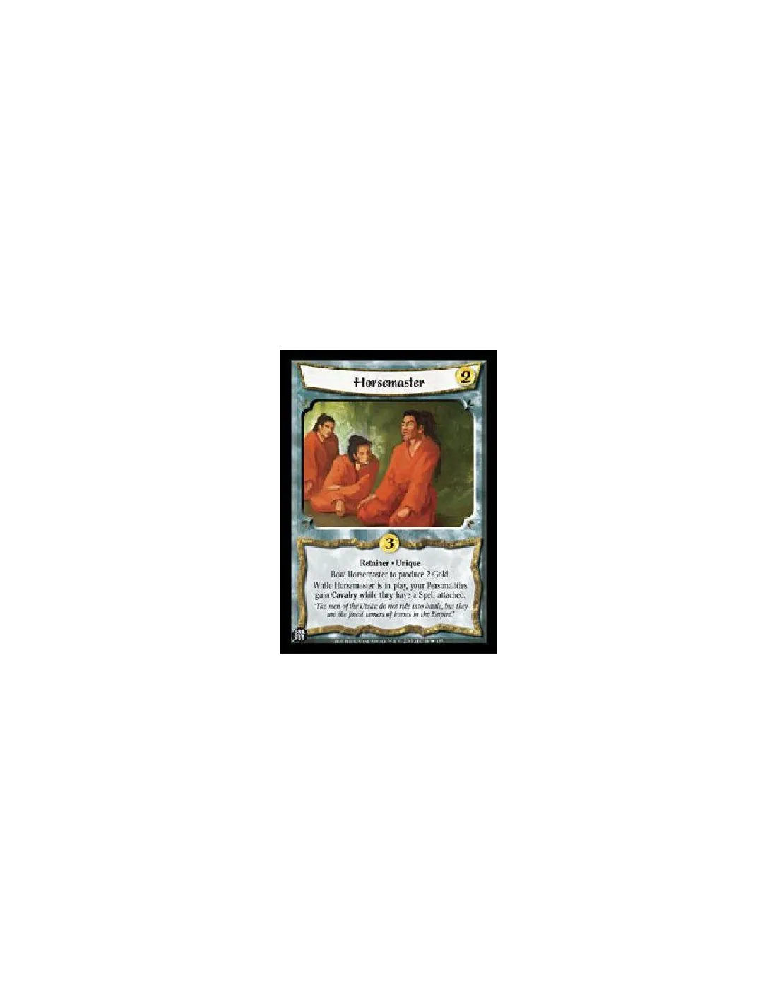 Retainer · UniqueBow Horsemaster to produce 2 Gold.While Horsemaster is in play, your Personalities gain Cavalry while they have a Spell attached.