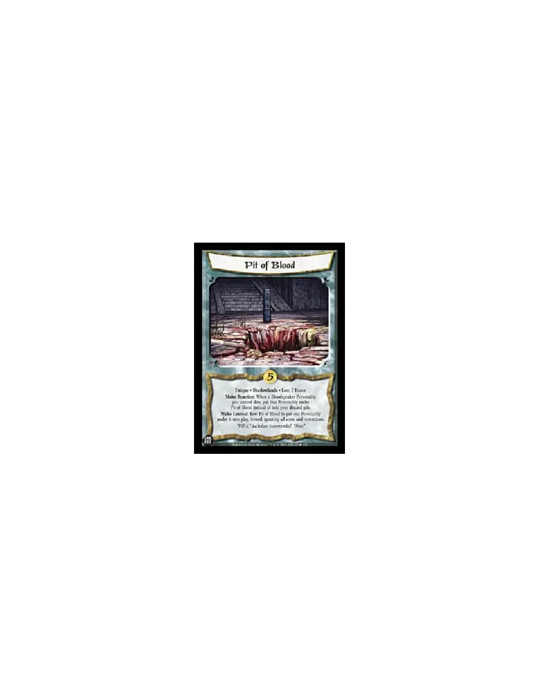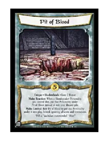 Unique · Shadowlands · Lose 2 Honor.Maho Reaction: When a Bloodspeaker Personality you control dies, put that Personality under Pit of Blood instead of into your discard pile.Maho Limited: Bow Pit of Blood to put one Personality under it into play, bowed, ignoring all costs and restrictions.