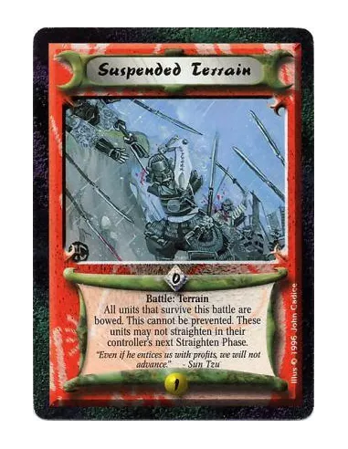 After this battle's Resolution Segment ends: Bow all units at the current battlefield, which will not be negated. Negate their straightening during their controllers' next Straighten Phases. Battle: If there are no Terrains at the current battlefield: Put this card into play there.