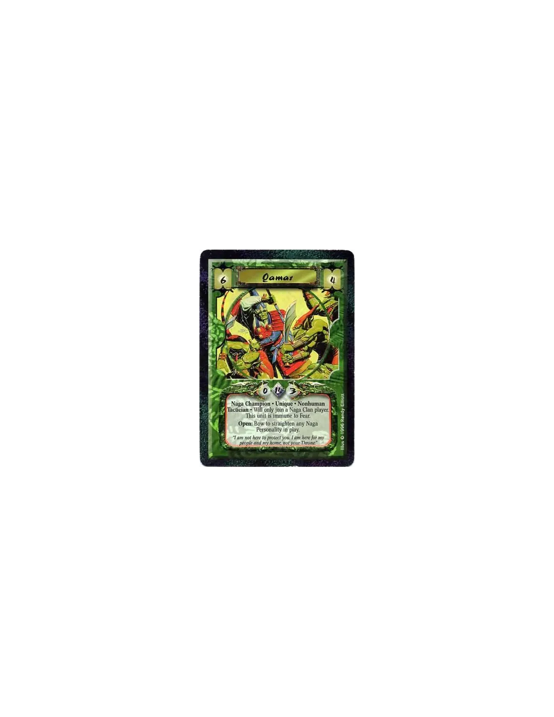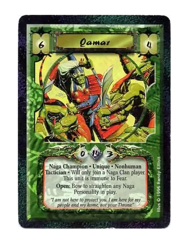 Negate all Fear effects upon cards in this unit. Battle/Open: Any number of times per turn, bow Qamar and target a Naga Personality: Straighten him.