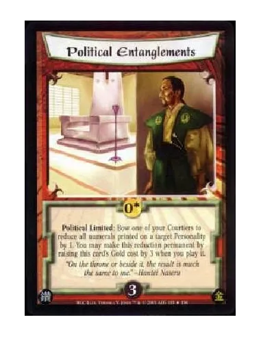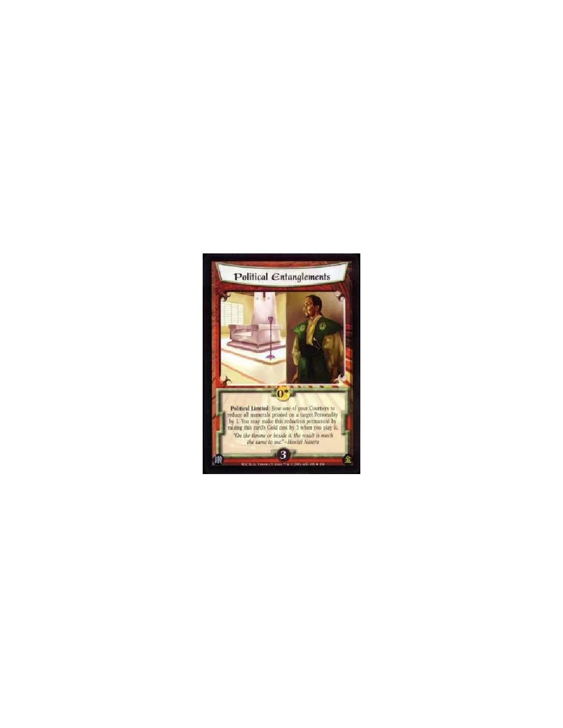 Political Limited: Bow one of your Courtiers to reduce all numerals printed on a target Personality by 1. You may make this reduction permanent by raising this card's Gold cost by 3 when you play it.