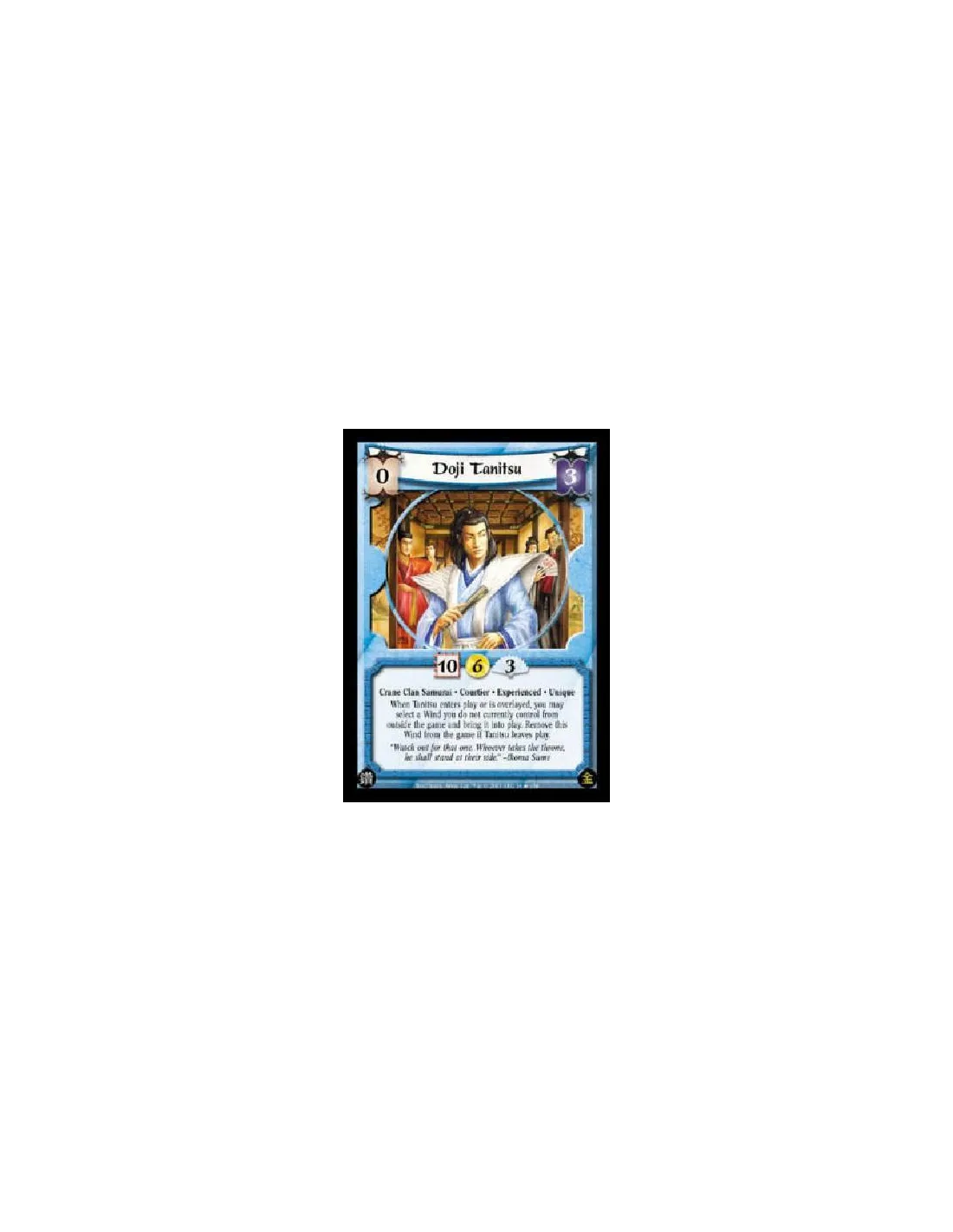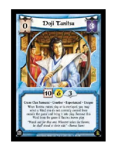 Crane Clan Samurai * Courtier * Experienced * Unique When Tanitsu enters play or is overlayed, you may select a Wind you do not currently control from outside the game and bring it into play. Remove this Wind from the game if Tanitsu leaves play.