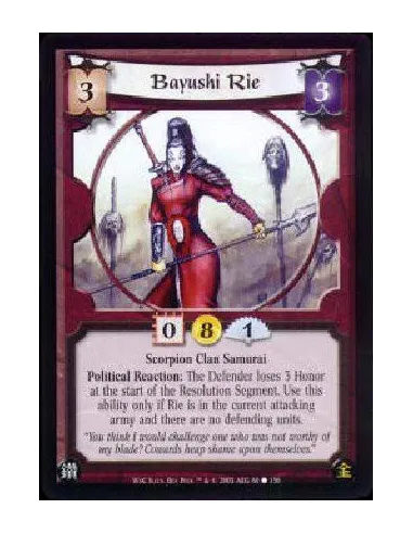 Scorpion Clan Samurai Political Reaction: The Defender loses 3 Honor at the start of the Resolution Segment. Use this ability only if Rie is in the current attacking army and there are no defending units.