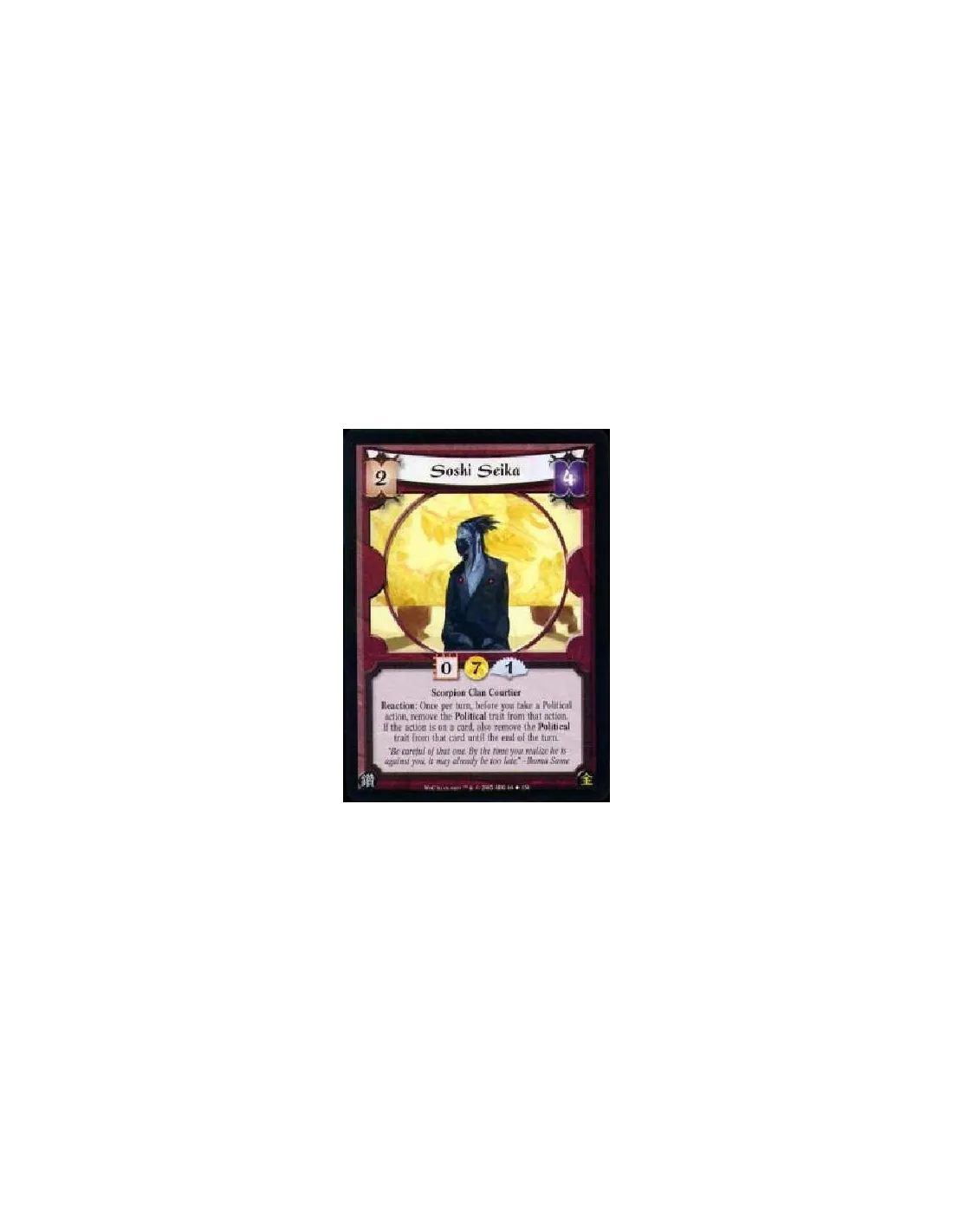 Scorpion Clan Courtier Reaction: Once per turn, before you take a Political action, remove the Political trait from that action. If the action is on a card, also remove the Political trait from that card until the end of the turn.