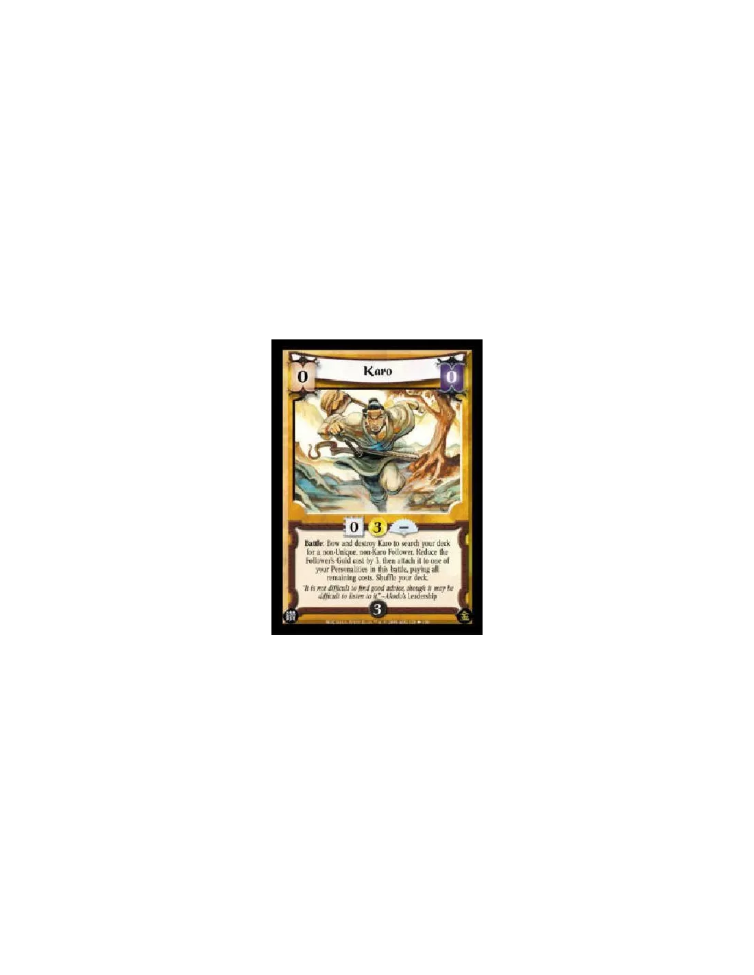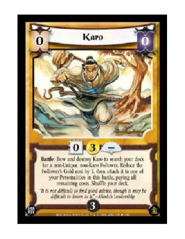 Battle: Bow and destroy Karo to search your deck for a non-Unique, non-Karo Follower. Reduce the Follower's Gold cost by 3, then attach it to one of your Personalities in this battle, paying all remaining costs. Shuffle your deck.