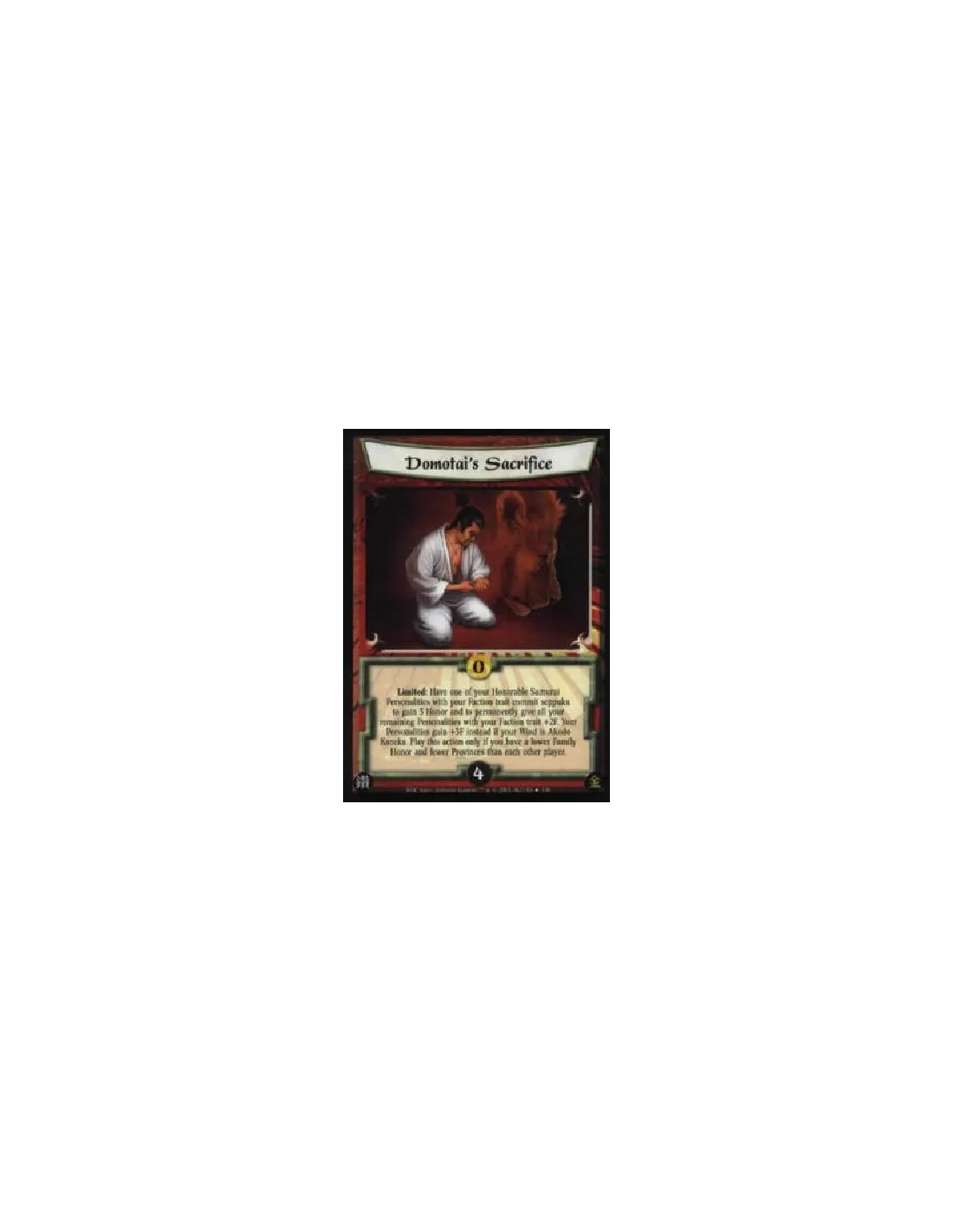 Limited: Have one of your Honorable Samurai Personalities with your Faction trait commit seppuku to gain 3 Honor and to permanently give all your remaining Personalities with your Faction trait +2F. Your Personalities gain +3F instead if your Wind is Akodo Kaneka. Play this action only if you have a lower Family Honor and fewer Provinces than each other player.