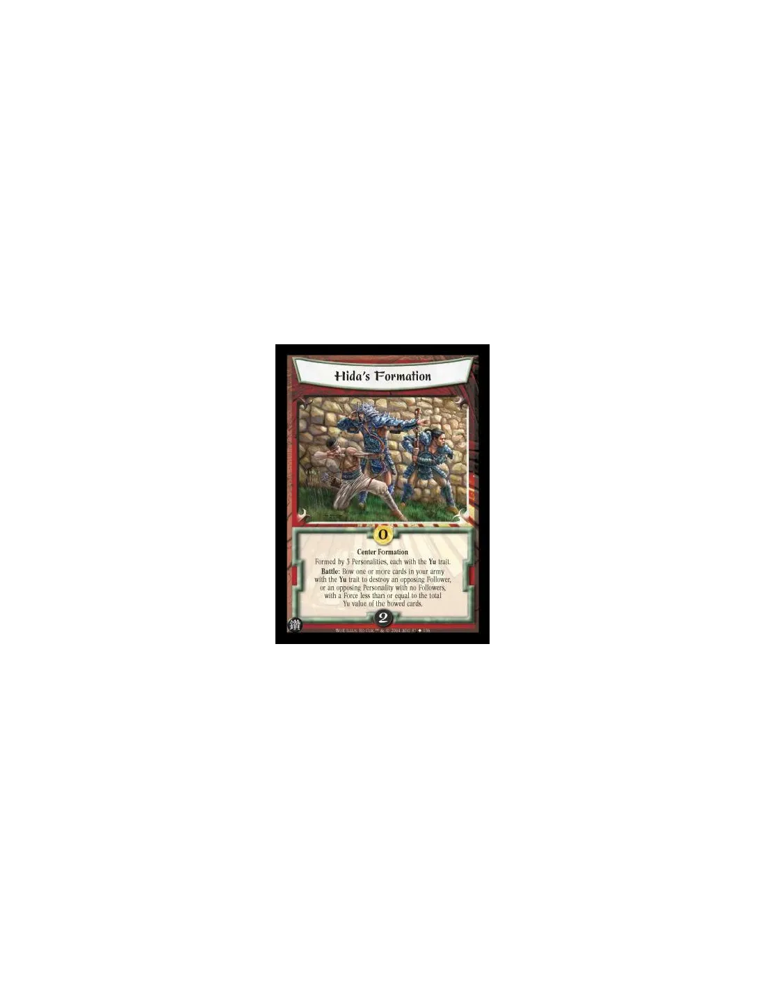 Center Formation Formed by 3 Personalities, each with the Yu trait. Battle: Bow one or more cards in your army with the Yu trait to destroy an opposing Follower, or an opposing Personality with no Followers, with a Force less than or equal to the total Yu