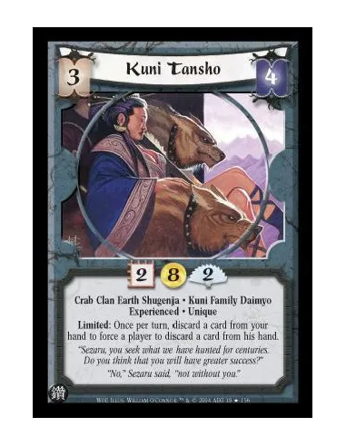 Crab Clan Earth Shugenja. Kuni Family Daimyo. Experienced. Unique Limited: Once per turn, discard a card from your hand to force a player to discard a card from his hand.