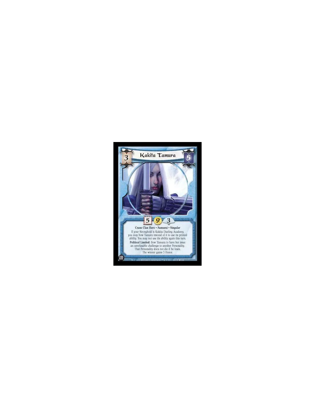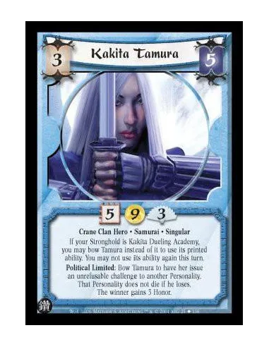 Crane Clan Hero. Samurai. Singular If your Stronghold is Kakita Dueling Academy, you may bow Tamura instead of it to use its printed ability. You may not use its ability again this turn. Political Limited: Bow Tamura to have her issue an unrefusable chall