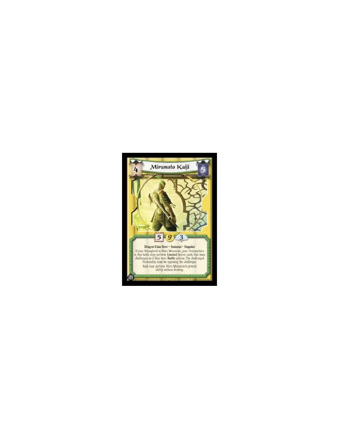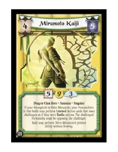 Dragon Clan Hero. Samurai. Singular If your Stronghold is Shiro Mirumoto, your Personalities in this battle may perform Limited Action cards that issue challenges as if they were Battle actions. The challenged Personality must be opposing the challenger.
