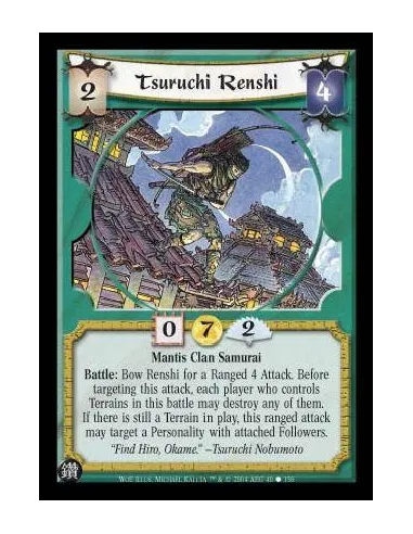Mantis Clan Samurai Battle: Bow Renshi for a Ranged 4 Attack. Before targeting this attack, each player who controls Terrains in this battle may destroy any of them. If there is still a Terrain in play, this ranged Attack may target a Personality with att