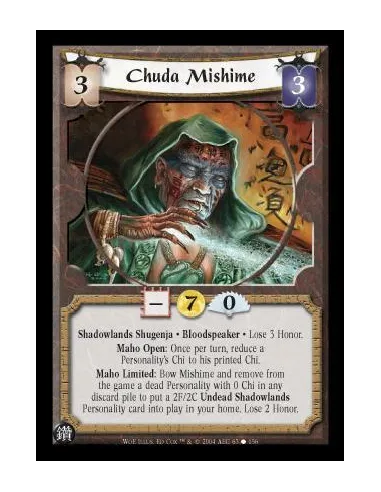 Shadowlands Shugenja. Bloodspeaker Lose 3 Honor. Maho Open: Once per turn, reduce a Personality's Chi to his printed Chi. Maho Limited: Bow Mishime and remove from the game a dead Personality with 0 Chi in any discard pile to put a 2F/2C Undead Shadowland