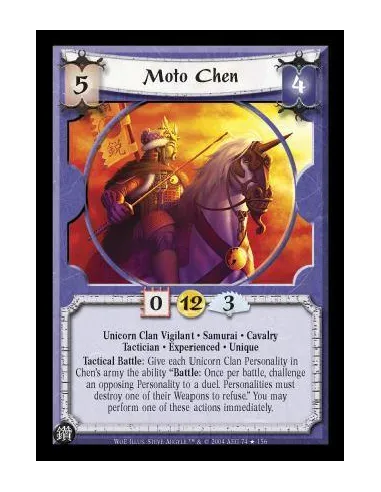 Unicorn Clan Vigilant. Samurai. Cavalry. Tactician. Experienced. Unique Tactical Battle: Give each Unicorn Clan Personality in Chen's army the ability "Battle: Once per battle, challenge an opposing Personality to a duel. Personalities must destroy one of