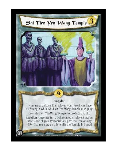 Singular If you are a Unicorn Clan player, your Provinces have +1 Strength while Shi-Tien Yen-Wang Temple is in play. Bow Shi-Tien Yen-Wang Temple to produce 3 Gold. Reaction: Once per turn, before another player's action targets one of your Personalities
