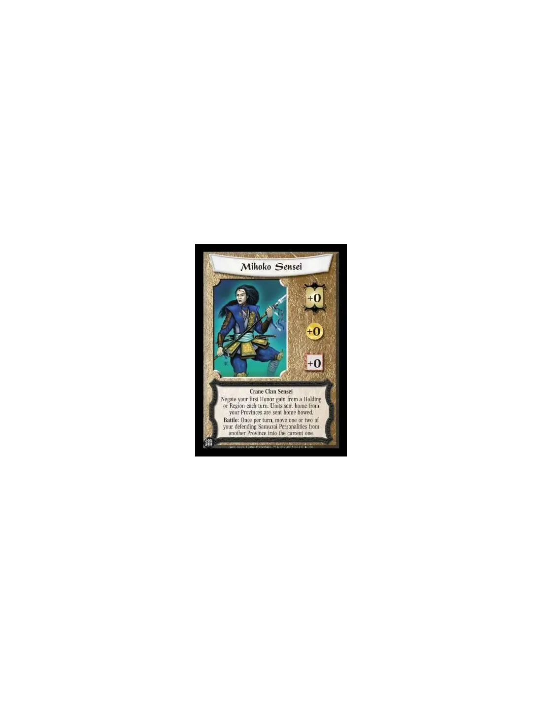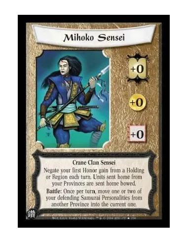 Crane Clan Sensei Negate your first Honor gain from a Holding or Region each turn. Units sent home from your Provinces are sent home bowed. Battle: Once per turn, move one or two of your defending Samurai Personalities from another Province into the curre