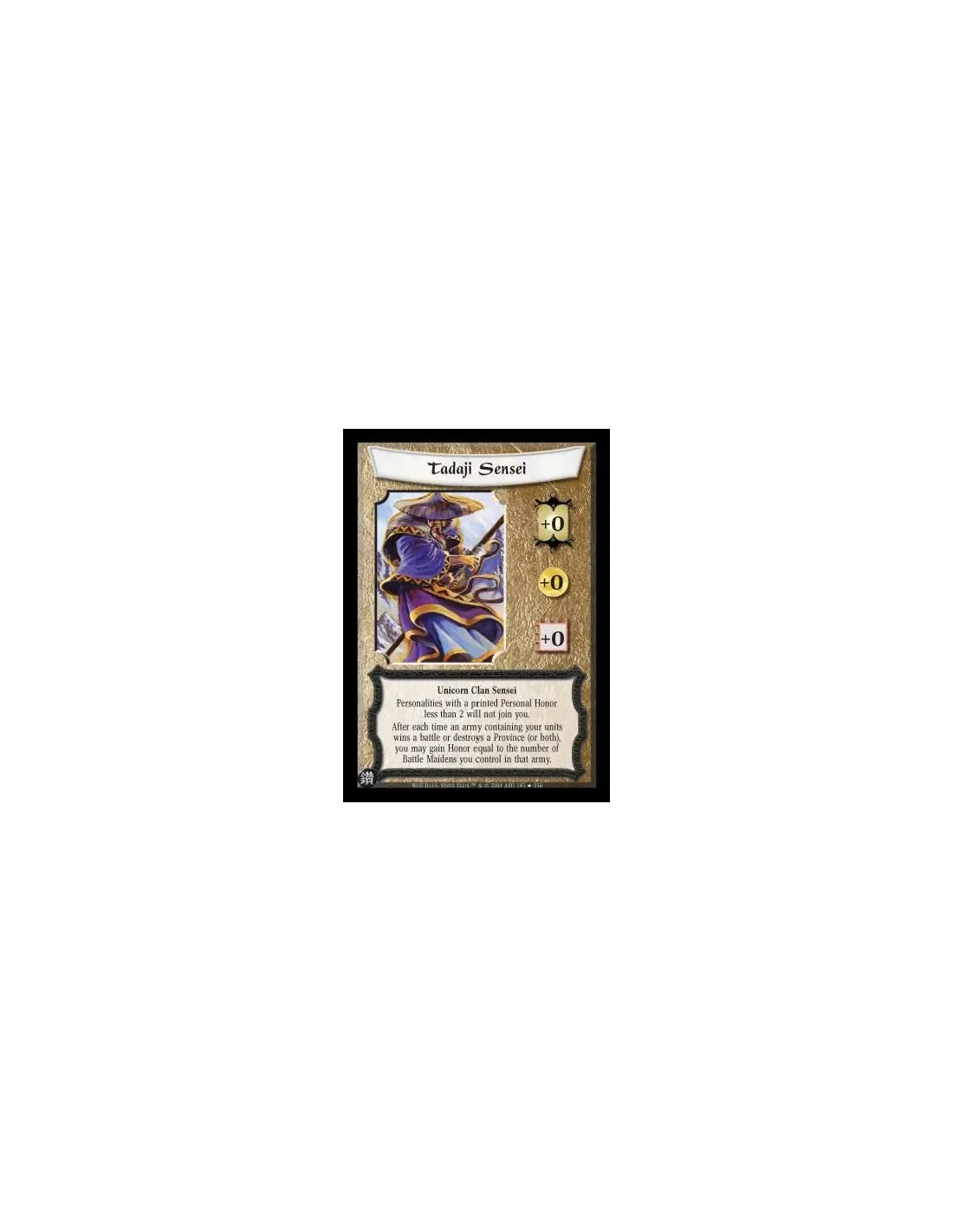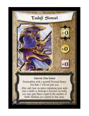 Unicorn Clan Sensei Personalities with a printed Personal Honor less than 2 will not join you. After each time an army containing your units wins a battle or destroys a Province (or both), you may gain Honor equal to the number of Battle Maidens you contr
