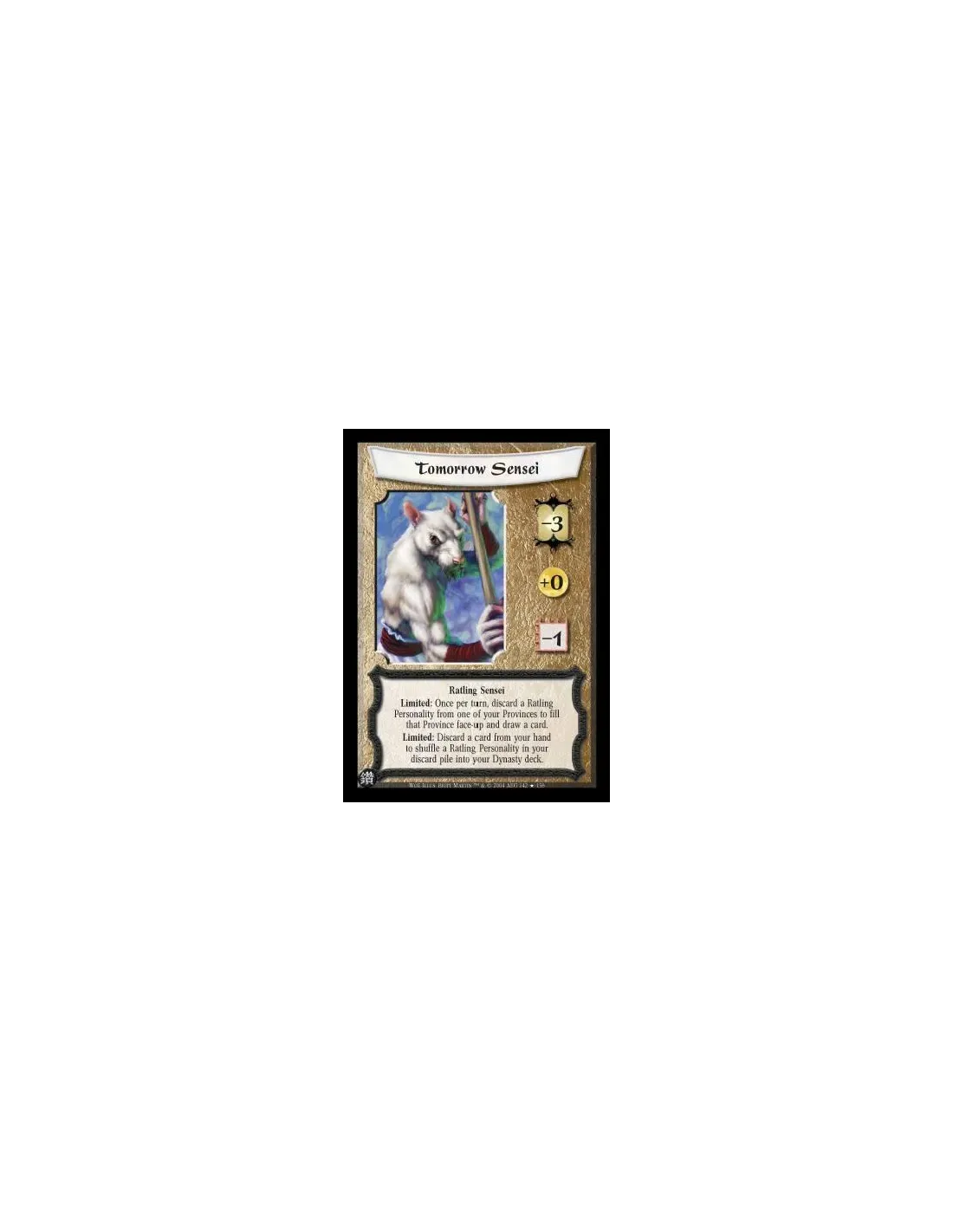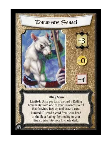 Ratling Sensei Limited: Once per turn, discard a Ratling Personality from one of your Provinces to fill that Province face-up and draw a card. Limited: Discard a card from your hand to shuffle a Ratling Personality in your discard pile into your Dynasty d