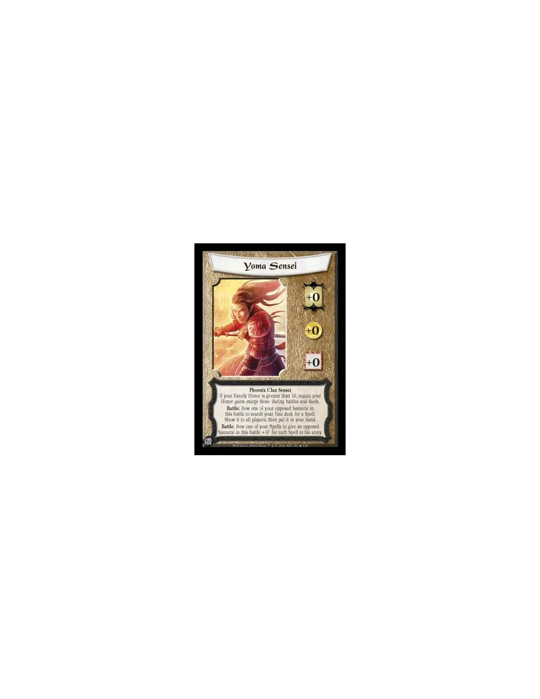 Phoenix Clan Sensei If your Family Honor is greater than 10, negate your Honor gains except those during battles and duels. Battle: Bow one of your opposed Samurai in this battle to search your Fate deck for a Spell. Show it to all players, then put it in