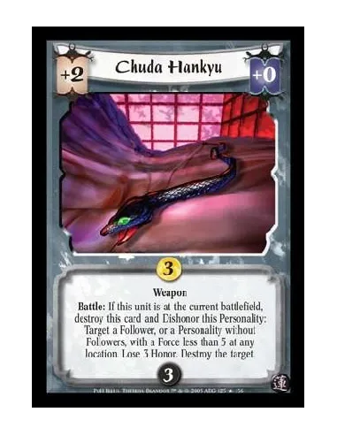 Weapon. Battle: If this unit is at the current battlefield, destroy this card and Dishonor this Personality: Target a Follower, or a Personality without Followers, with a Force less than 5 at any location. Lose 3 Honor. Destroy the target.