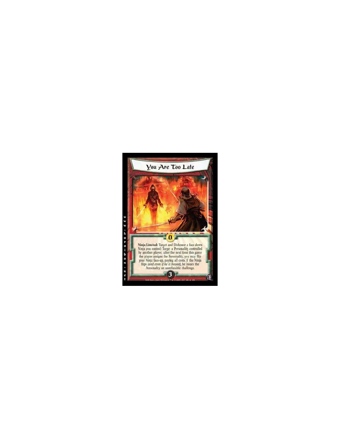 Ninja Limited: Target and Dishonor a face-down Ninja you control: Target a Personality controlled by another player. After the next time this game the player assigns the Personality, you may flip the Ninja face-up, paying all costs. If the Ninja flips (and even if he I bowed), he issues the Personality an unrefusable challenge