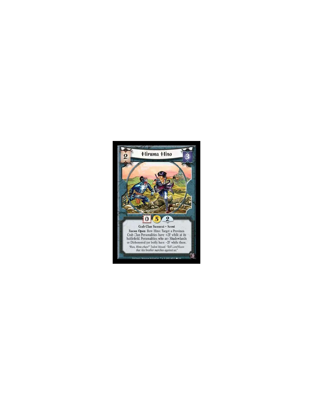 Crab Clan Samurai · Scout. Recon Open: Bow Hino: Target a Province. Crab Clan Personalities have +2F while at its battlefield. Personalities who are Shadowlands or Dishonored (or both) have -2F while there.