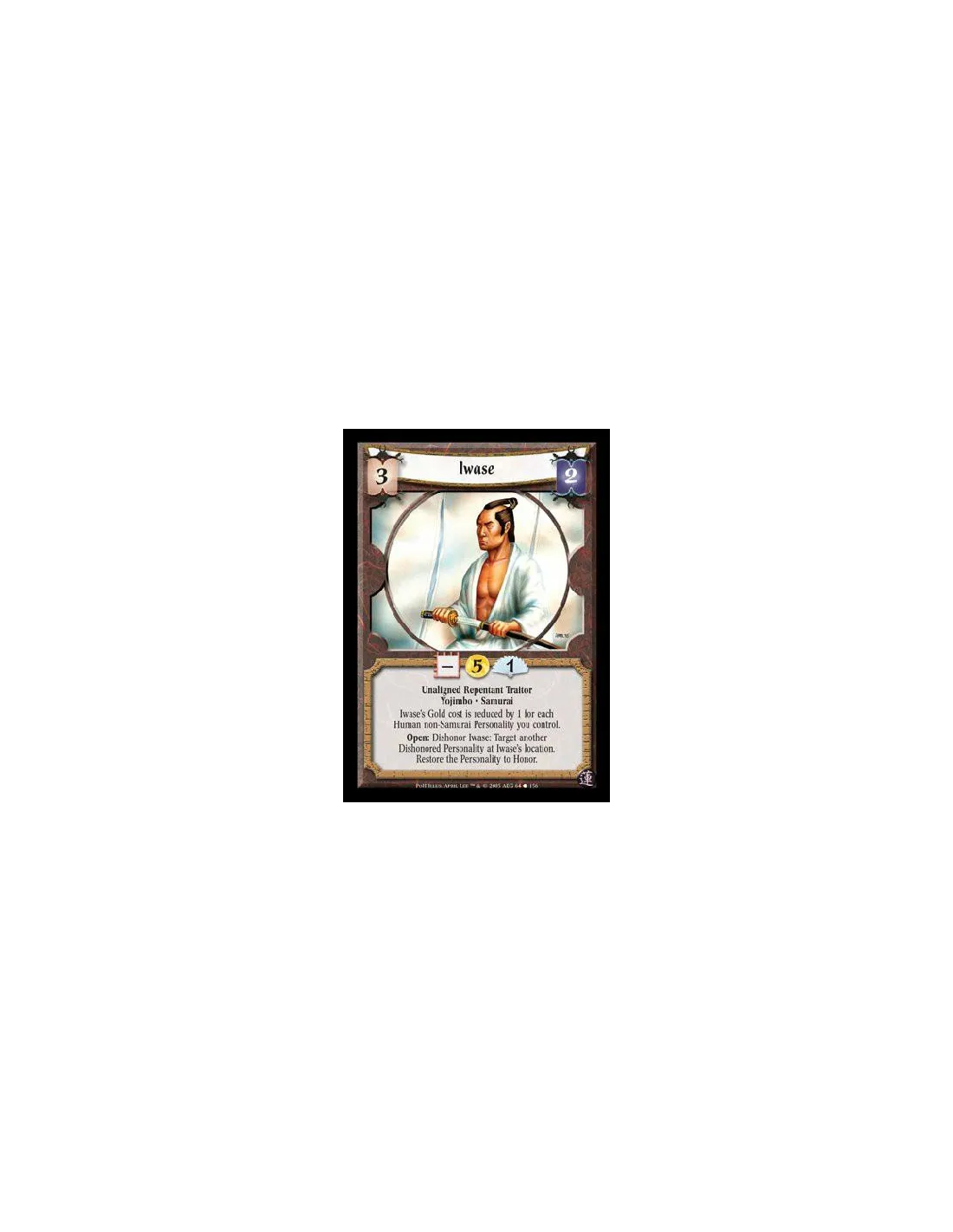 Unaligned Repentant Traitor · Yojimbo · Samurai. Isawe's Gold cost is reduced by 1 for each Human non-Samurai Personality you control. Open: Dishonor Iwase: Target another Dishonored Personality at Iwase's location. Restore the Personality to Honor