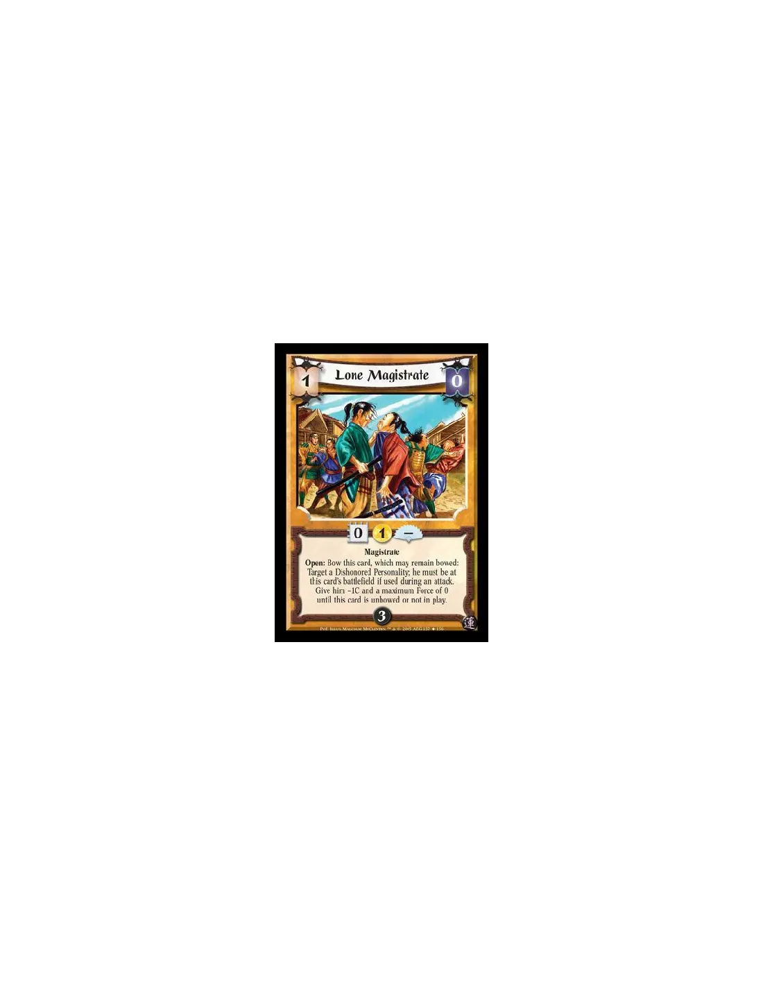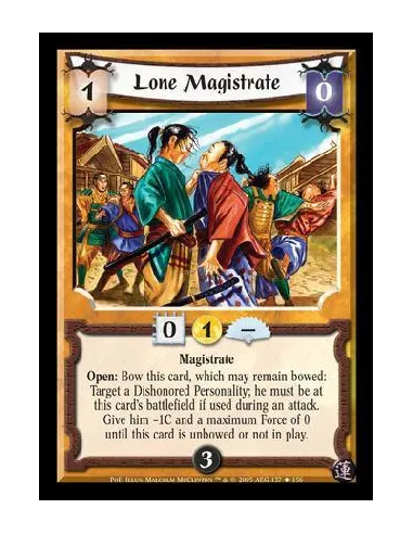 Magistrate. Open: Bow this card, which may remain bowed: Target a Dishonored Personality; he must be at this card's battlefield if used during an attack. Give him -1C and a maximum Force of 0 until this card is unbowed or not in play