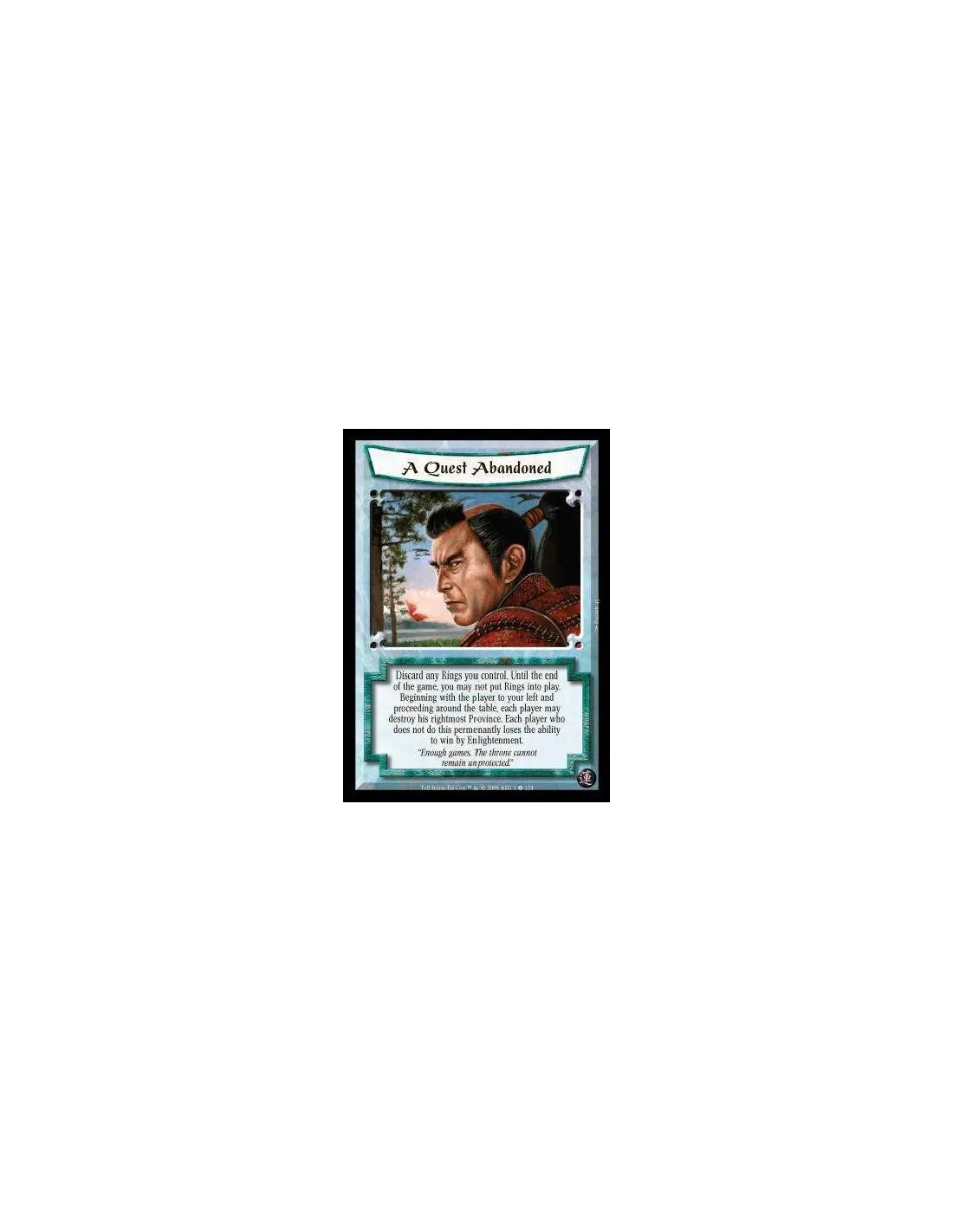 Discard any Rings you control. Until the end of the game, you may not put Rings into play. Beginning with the player to your left and proceeding around the table, each player may destroy his rightmost Province. Each player who does not do this permenantly loses the ability to win by Enlightenment.
