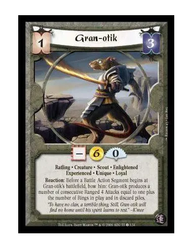 Ratling · Creature · Scout · Enlightened · Experienced · Unique · Loyal. Reaction: Before a Battle Action Segment begins at Gran-otik's battlefield, bow him: Gran-otik produces a number of consecutive Ranged 4 Attacks equal to one plus the number of Rings in play and in discard piles.