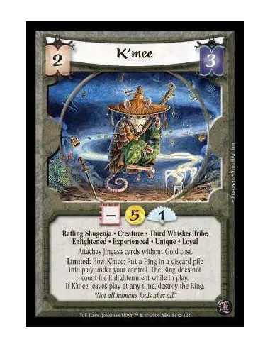 Ratling Shugenja · Creature · Third Whisker Tribe · Enlightened · Experienced · Unique · Loyal. Attaches Jingasa cards without Gold cost. Limited: Bow K'mee: Put a Ring in a discard pile into play under your control. The Ring does not count for Enlightenment while in play. If K'mee leaves play at any time, destroy the Ring.
