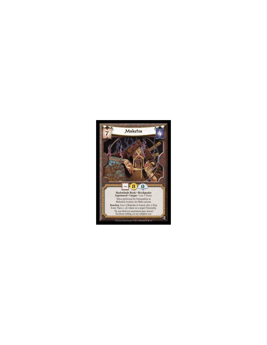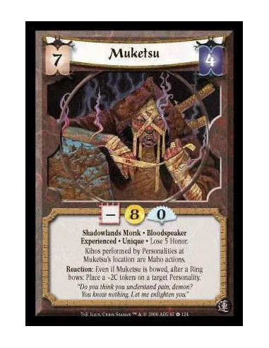 Spider Clan · Monk · Shadowlands · Experienced · Unique · Lose 5 Honor. Reaction: Even if Muketsu is bowed, after a Ring bows: Give a target Personality a -2C token.