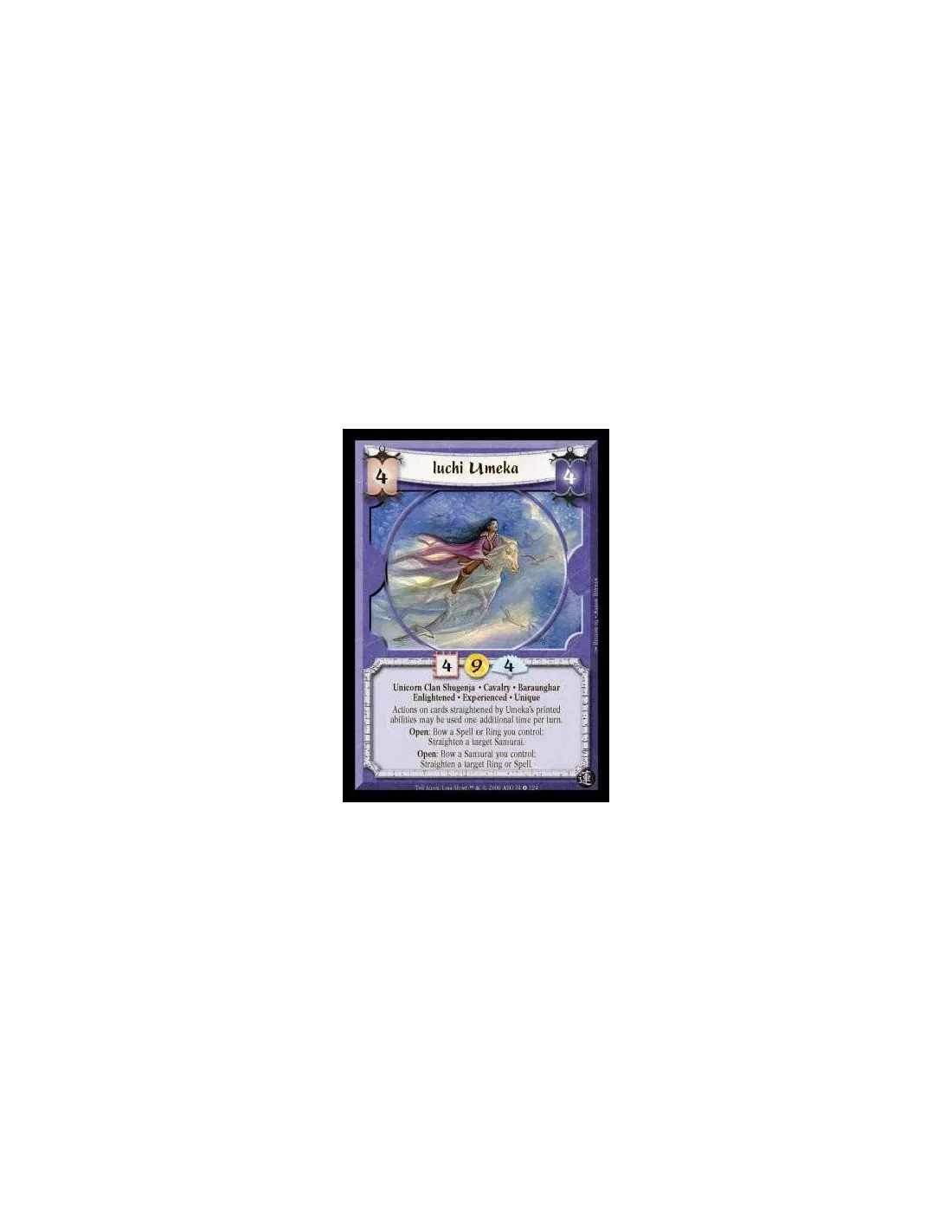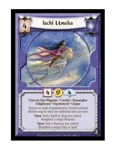 Unicorn Clan Shugenja · Cavalry · Baraunghar · Enlightened · Experienced · Unique. Actions on cards straightened by Umeka's printed abilities may be used one additional time per turn. Open: Bow a Spell or Ring you control: Straighten a target Samurai. Open: Bow a Samurai you control: Straighten a target Ring or Spell.