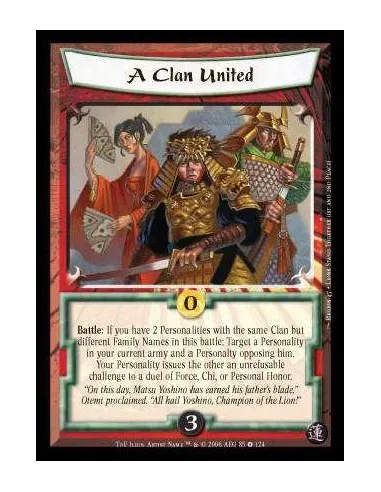 Battle: If you have 2 Personalities with the same Clan but different Family Names in this battle: Target a Personality in your current army and a Personality opposing him. Your Personality issues the other an unrefusable challenge to a duel of Force, Chi, or Personal Honor.
