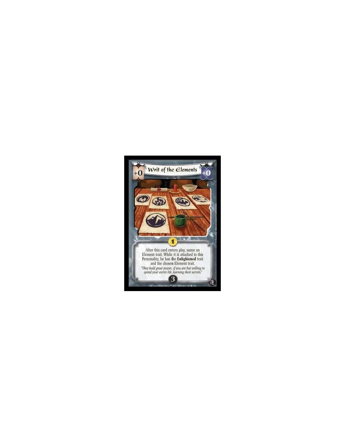 After this card enters play, name an Element trait. While it is attached to this Personality, he has the Enlightened trait and the chosen Element trait.