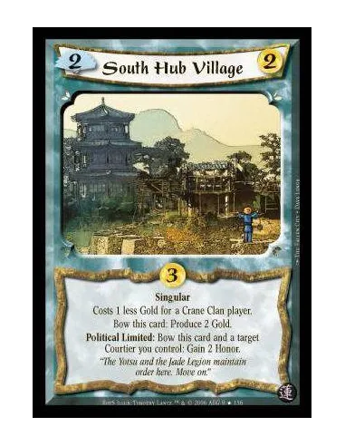 Singular. Costs 1 less Gold for a Crane Clan player. Bow this card: Produce 2 Gold. Political Limited: Bow this card and a target Courtier you control: Gain 2 Honor.