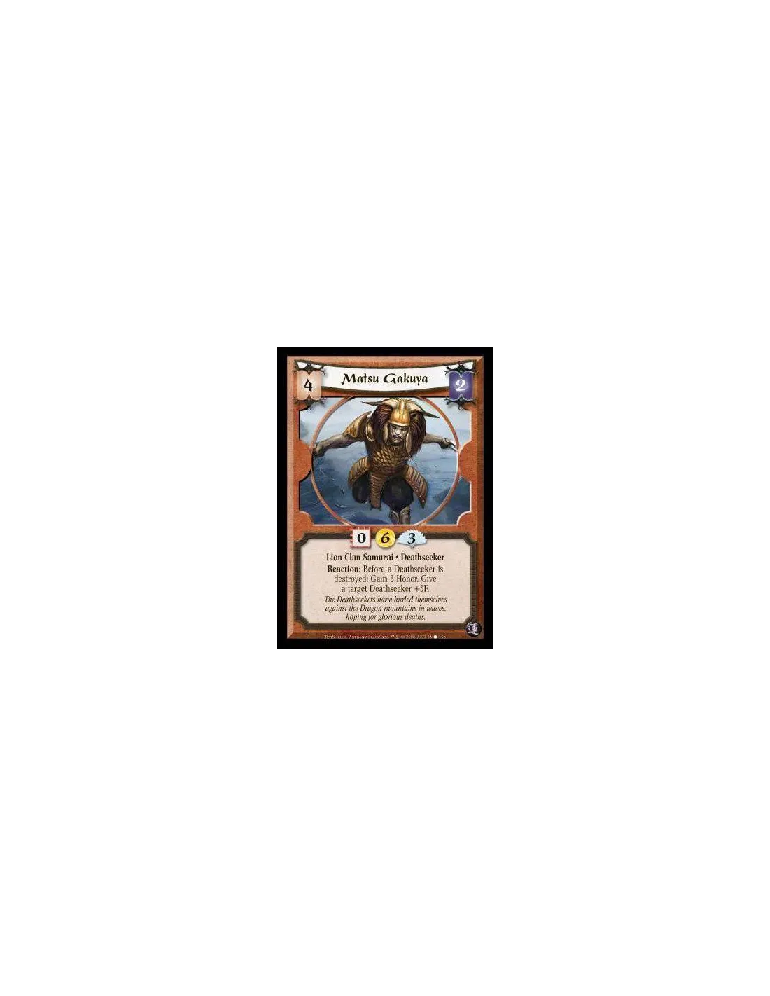 Lion Clan Samurai · Deathseeker. Reaction: Before a Deathseeker is destroyed: Gain 3 Honor. Give a target Deathseeker +3F.
