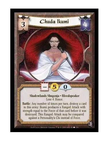 Spider Clan · Shugenja · Shadowlands. Lose 4 Honor. Battle: Any number of times per turn, destroy one of your cards in this army: Ranged Attack whose strength equals the card's Force before it was destroyed, and which you may compare against a Personality's Chi instead of Force.