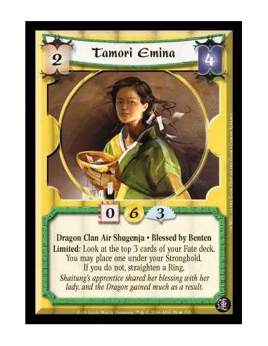 Dragon Clan Air Shugenja · Blessed by Benten. Limited: Look at the top 3 cards of your Fate deck. You may place one under your Stronghold. If you do not, straighten a Ring.