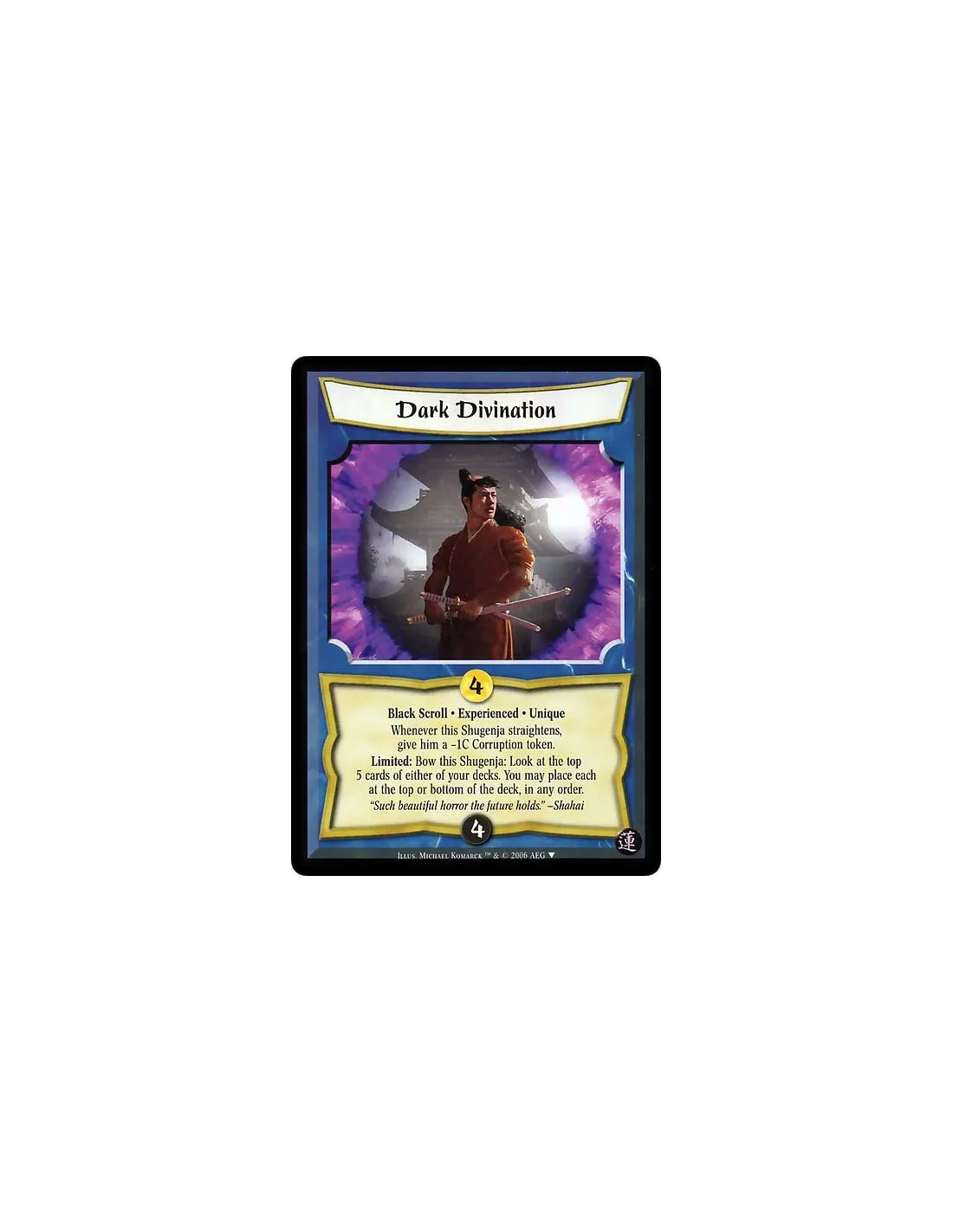 Black Scroll • Experienced • Unique Whenever this Shugenja straightens, give him a -1C Corruption token. Limited: Bow this Shugenja: Look at the top 5 cards of either of your decks. You may place each at the top or bottom of the deck, in any order.