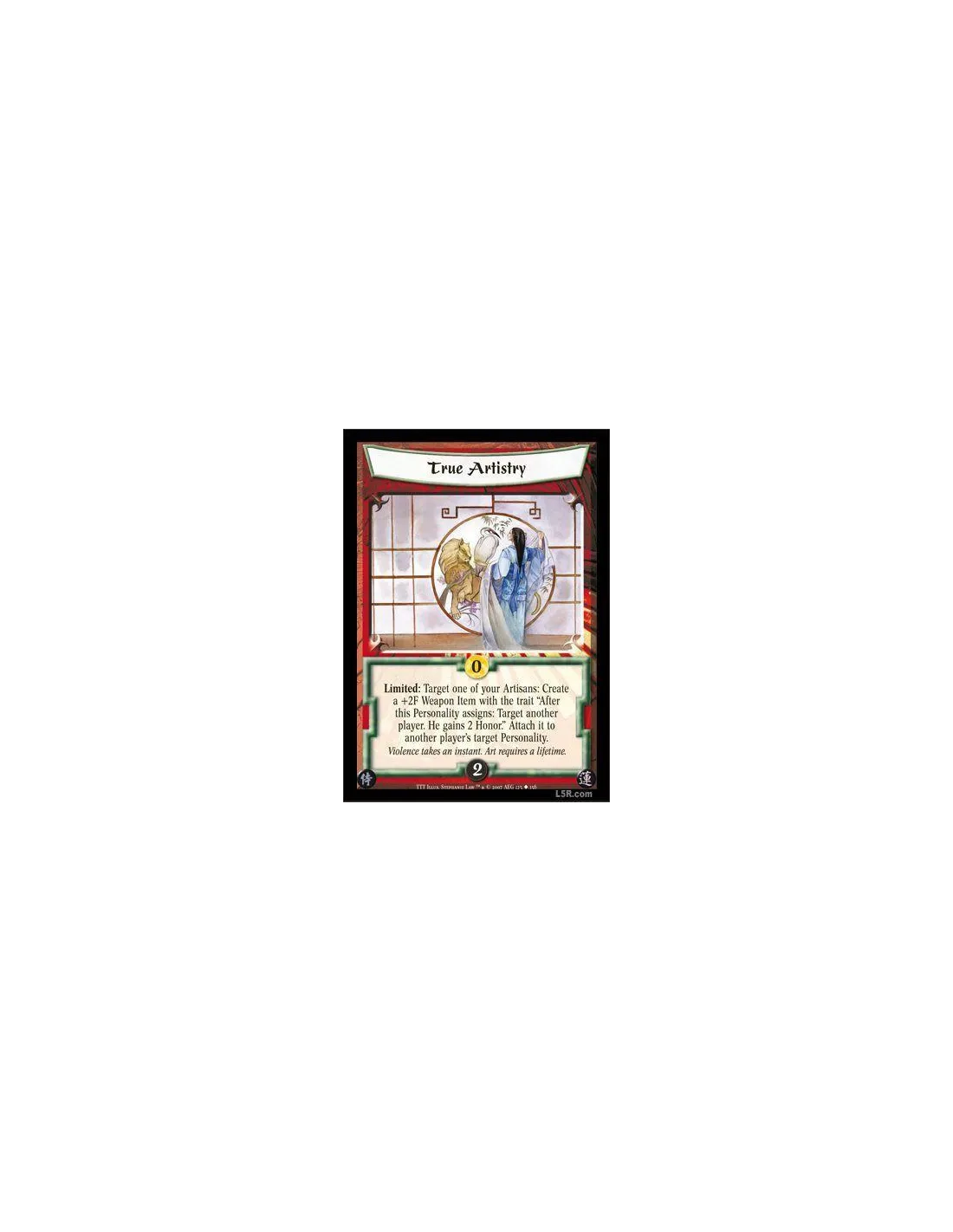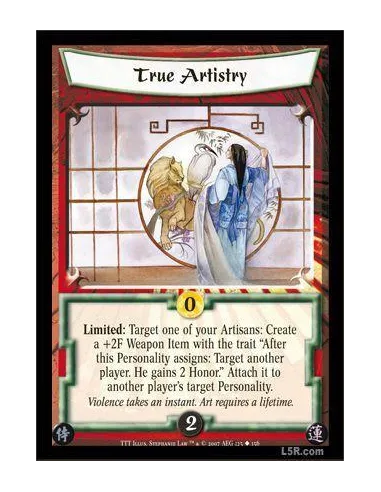 Limited: Target one of your Artisans: Create a +2F Weapon Item with the trait ?After this Personality assigns: Target another player. He gains 2 Honor.? Attach it to another player's target Personality.