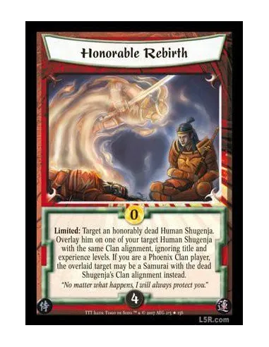 Limited: Target an honorably dead Human Shugenja. Overlay him on one of your target Human Shugenja with the same Clan alignment, ignoring title and experience levels. If you are a Phoenix Clan player, the overlaid target may be a Samurai with the dead Shugenja's Clan alignment instead